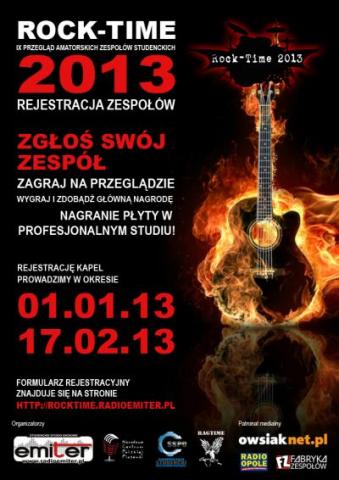 Już 13 marca odbędzie się kolejna edycja przeglądu najlepszych zespołów, które największe sceny świata mają dopiero przed sobą. Tegoroczny Rock-Time odbędzie się w Sali Kameralnej Narodowego Centrum Polskiej Piosenki. Wszystkich chętnych, którzy mają odwagę i chcą spróbować swoich sił zapraszamy do bezpłatnej rejestracji, która trwa od 1 stycznia do 17 lutego 2013 roku.
